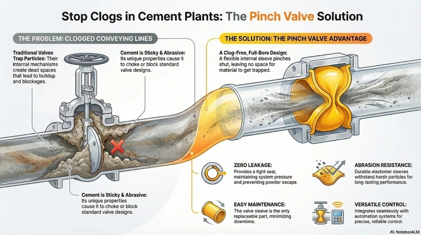Pinch valves use a flexible sleeve via manual, pneumatic, hydraulic, or electric actuation, creating a full-bore seal free of dead spaces. This design prevents particle entrapment, making them ideal powder handling valves for abrasive cement. Reliable pneumatic conveying valves must provide a tight seal without obstructing flow to guarantee uninterrupted bulk solids handling valve performance.
